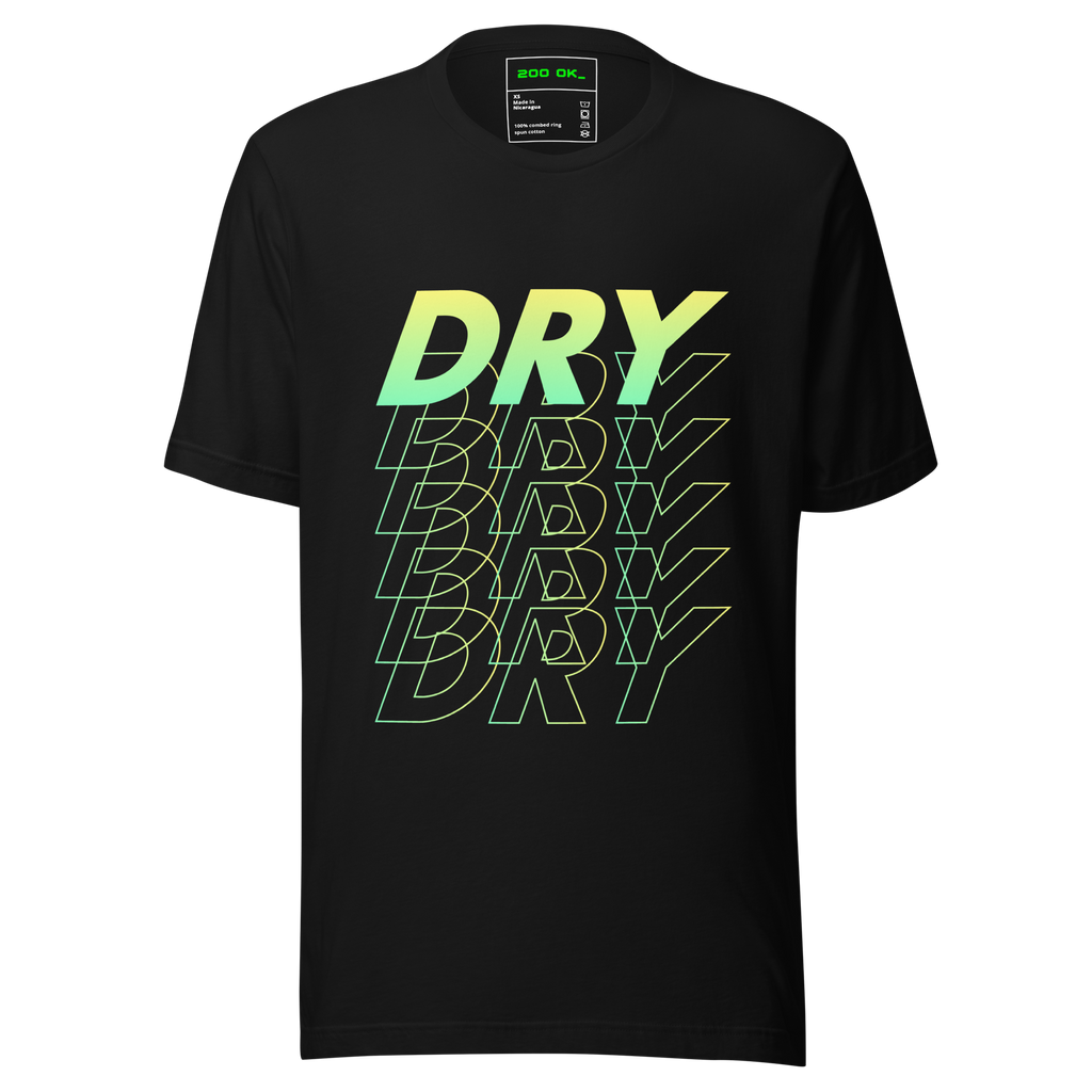 The DRY tee drips in neon energy, flexing clean-code swagger with cyber-street cool. For devs who write it once, own it twice, and leave the bugs to amateurs.