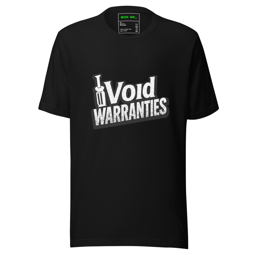 I Void Warranties” Tee – A witty and rebellious design for hackers, tinkerers, and tech enthusiasts who love pushing limits, breaking rules, and customizing everything beyond the manual.