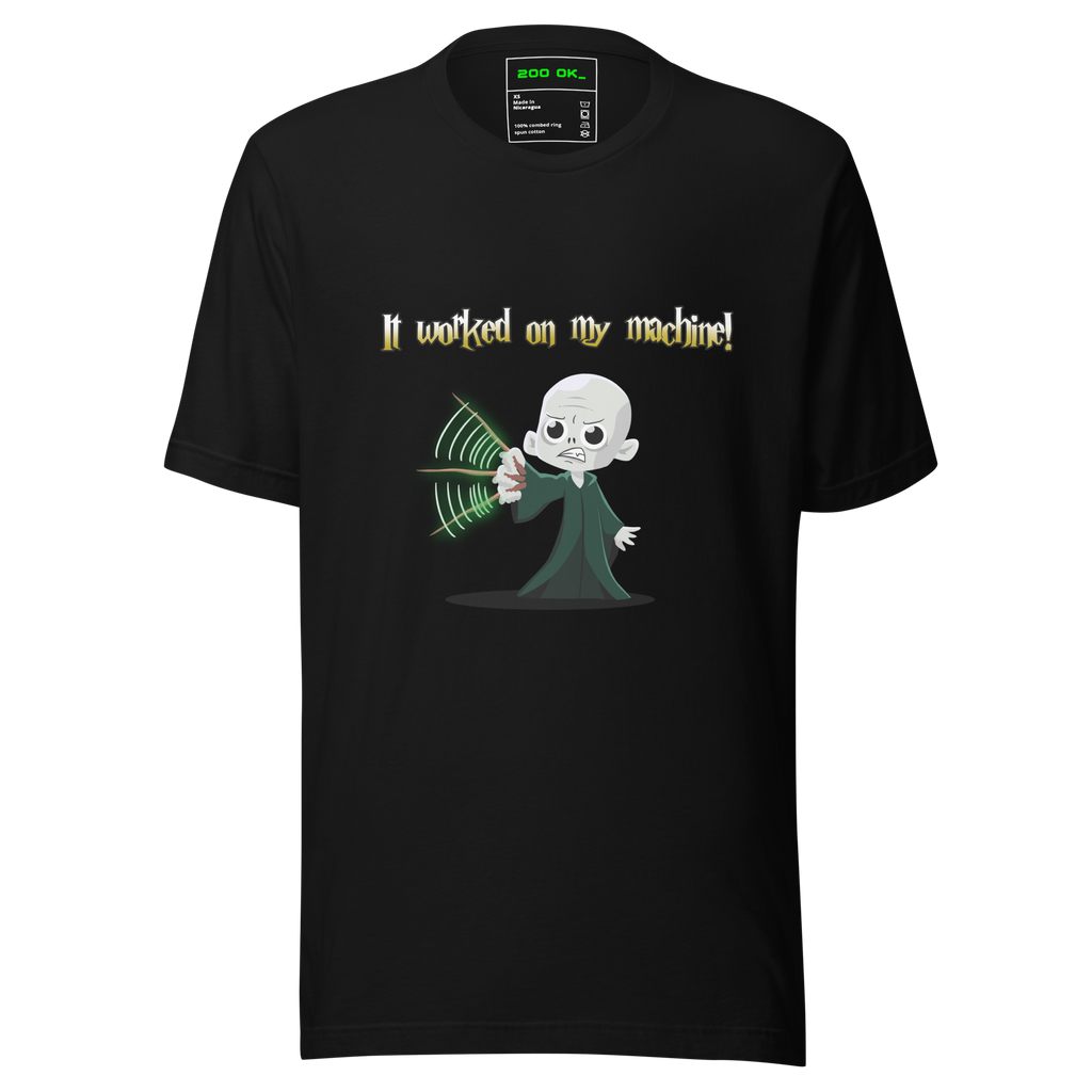 It Worked on My Machine” Tee – A witty developer classic, this design captures the universal excuse for broken code. Featuring a fun wizard-style character, it’s perfect for programmers, testers, and anyone who’s battled the “but it works locally” struggle.