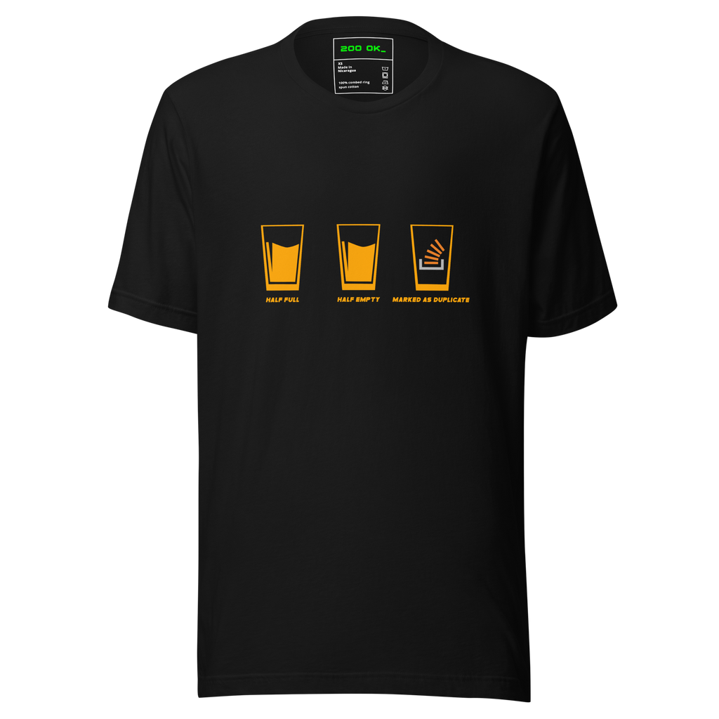 “Marked as Duplicate” Tee – A clever design showing glasses labeled half full, half empty, and finally “marked as duplicate,” making it the perfect shirt for developers, testers, and anyone who loves witty debugging humor.