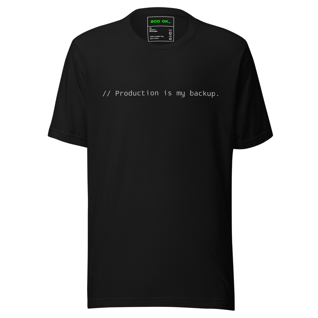 Why waste time setting up backups when you can just YOLO deploy? This tee is for the fearless (or reckless) devs who treat production like a testing ground. Equal parts confession and flex, it’s the perfect uniform for living on the edge of disaster recovery. Wear it to the office, the stand-up meeting, or your next 3 AM rollback session — because who really needs staging anyway?